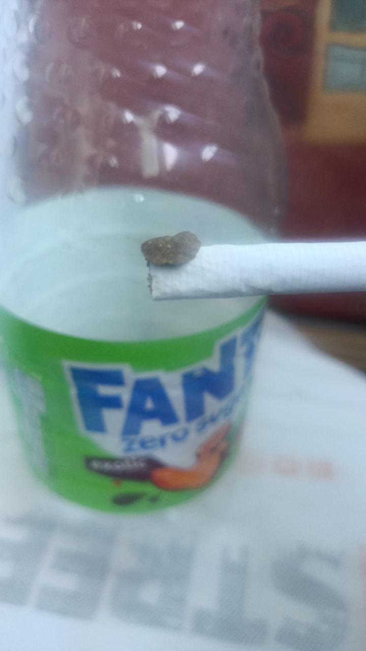 Приступил к тесту. Решил курить классическим способом — через бутылку с сигаретой. На уголёк положил примерно 2-2,5 спичечные головки гашиша. Плюшка горит хорошо, дым насыщенный и густой. Заполнив бутылку дымом, вдохнул его полностью.