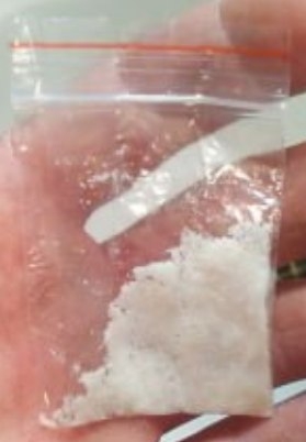 Приехав домой, открыл пакет и насыпал содержимое на стол. Передо мной оказался жёлтый порошок с кристаллами, обладающий специфическим легким запахом типичного мефедрона.